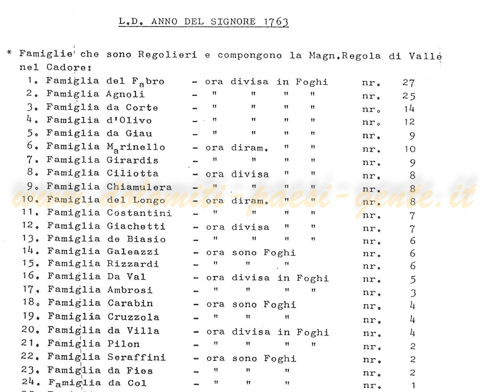 Famiglie Regolieri di Valle di C. - anno 1763